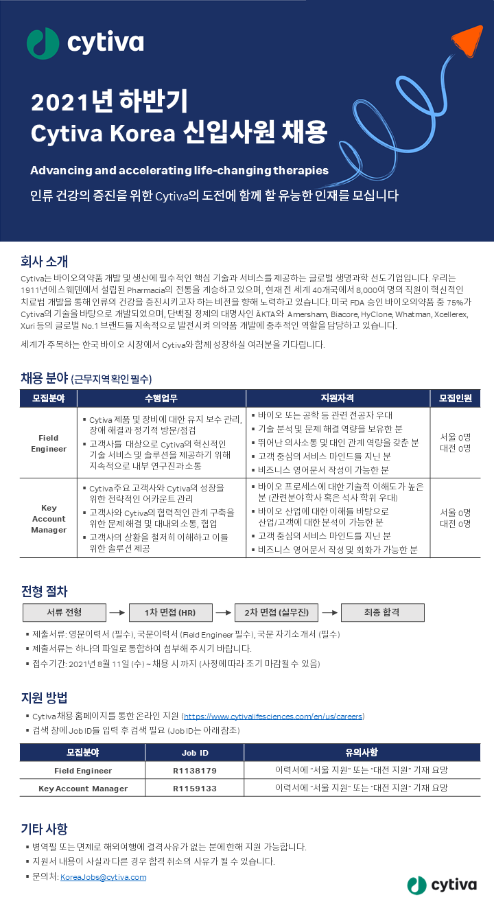 - 지원방법 : Cytiva 채용 홈페이지를 통한 온라인 지원 (https://www.cytivalifesciences.com/en/us/careers)