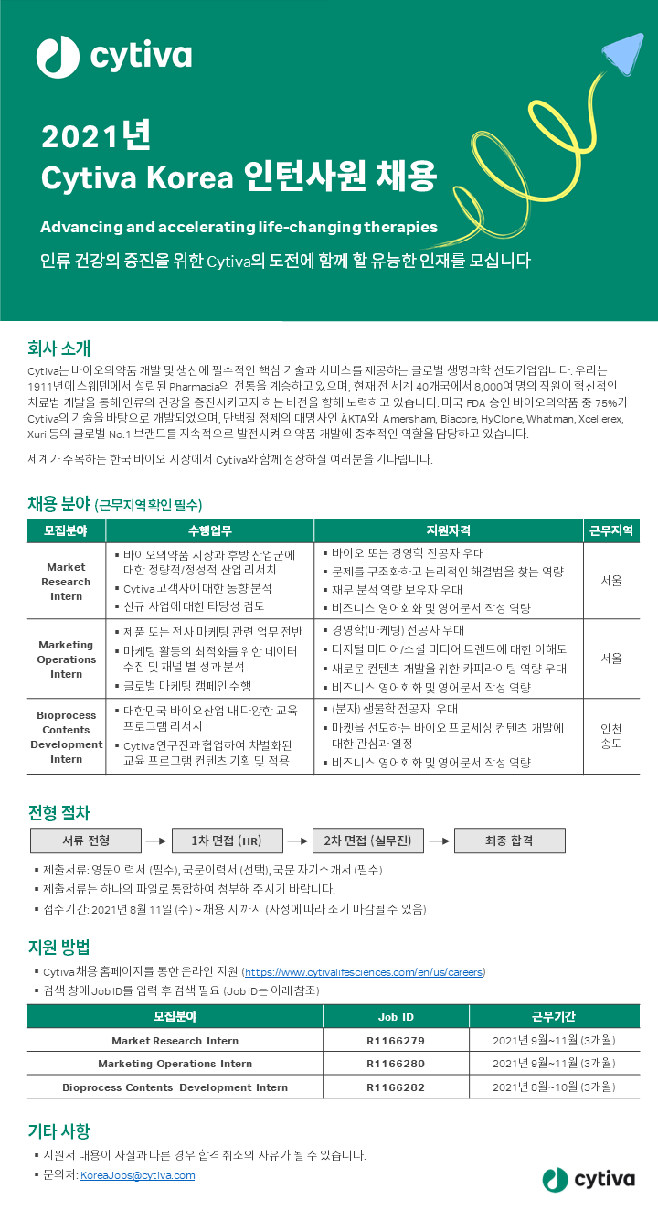 [취업공지] Cytiva_Korea_2021_하반기_신입사원_및_인턴사원_채용공고